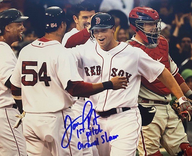 Daniel Nava Hand signed this glossy w/ "1st Pitch Grand Slam" inscription. A Sure Shot...