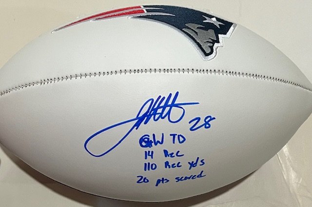 James White hand signed this Patriots Football with a "GW TD, 14 Rec 110 yds...