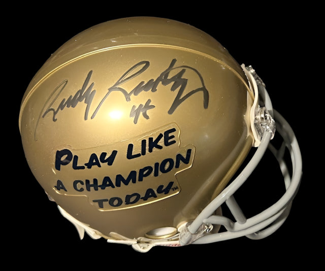 Rudy Ruettiger hand signed this Play Like a Champion Today mini helmet. A Sure Shot...