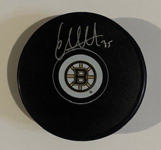 Linus Ullmark hand signed this Bruins puck. A Fanatics Hologram Verification is included.