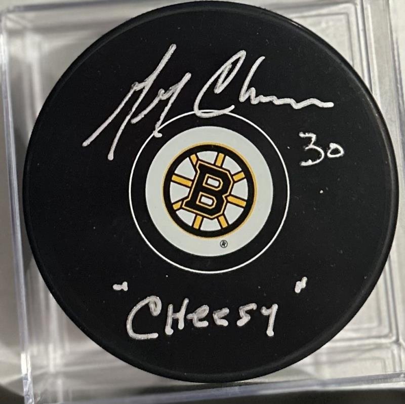 Gerry Cheevers hand signed this puck with a "Cheesy" inscription. A Sure Shot Promotions Certificate...