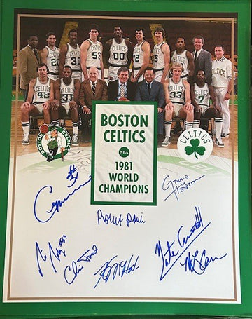 Robert Parish, Kevin McHale, ML Carr, Gerald Henderson, Cedric Maxwell, Rick Robey, Chris Ford and Nate Archibald hand signed this 16x20 photo. A Sure Shot Promotions Certificate of Authenticity is included