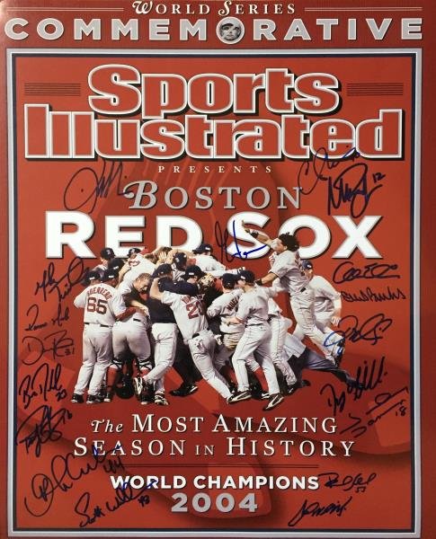 SI COVER BLUE INK - Bronson Arroyo Mark Bellhorn, Ellis Burks, Orlando Cabrera, Johnny Damon, Brian Daubach, Lenny DiNardo, Alan Embree, Ricky Gutierrez, Gabe Kapler, Curt Leskanic, Ramiro Mendoza, Doug Mientkiewicz, Kevin Millar, Doug Mirabelli, Dave Roberts, Phil Seibel, Mike Timlin, and Scott Williamson hand signed this 16x20 glossy photo. A Sure Shot Promotions Certificate of Authenticity is included.