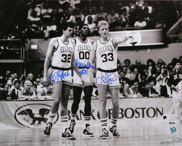 Boston Celtics legends - Robert Parish, Kevin McHale and Larry Bird hand signed this 16x20 glossy photo.