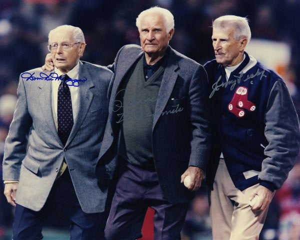 Dom DiMaggio, Bobby Doerr and Johnny Pesky hand signed this 11x14 glossy photo with a "The Teammates" inscription from Doerr.