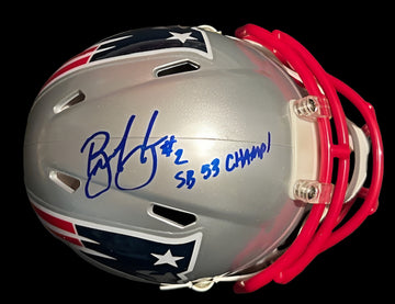 SB Champ Brian Hoyer hand signed this Patriots mini Helmet with a SB Champ inscription.