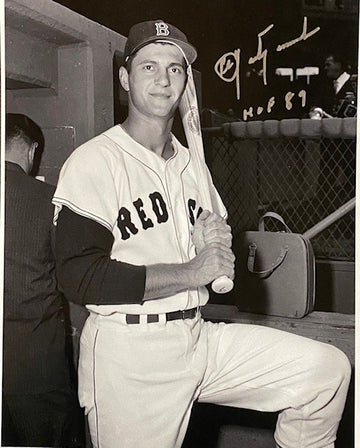 Carl Yastrzemski hand signed this 11x14 glossy photo with a "HOF 89"inscription.