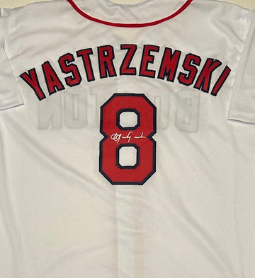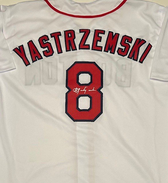 Red Sox legend and Baseball Hall of Famer Carl Yastrzemski hand signed this Custom jersey in silver paint pen.
