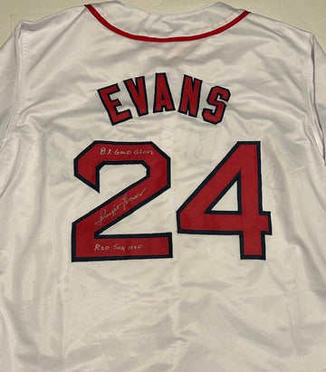 Dwight Evans hand signed this custom Red Sox jersey with a “8x Gold Glove and Red Sox HOF” Inscription. A Sure Shot Promotions certificate of authenticity is included.