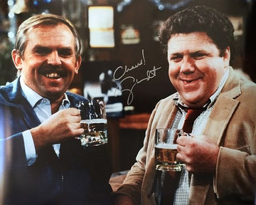 George Wendt hand signed this 16x20 glossy photo with a "Cheers" inscription. A Sure Shot Promotions Certificate of Authenticity is included.
