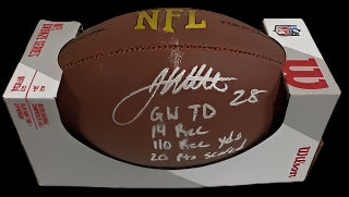 James White hand signed this Wilson NFL Football with a "GW TD,14 Rec,110 Rec Yds, 20 pts scored" inscription.