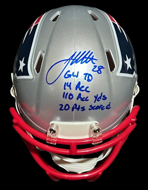 James White hand signed this Patriots mini helmet with GW TD, 14 REC, 110 REC YDS, 20PTS Scored inscription.