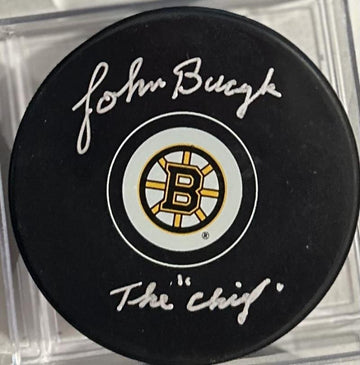 John Bucyk hand signed this puck an "The Chief" inscription. A Sure Shot Promotions Certificate of Authenticity is included.