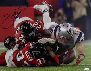 Julian Edelman hand signed this 16x20 glossy photo from Super Bowl LI where he made arguably the greatest catch in NFL history.
