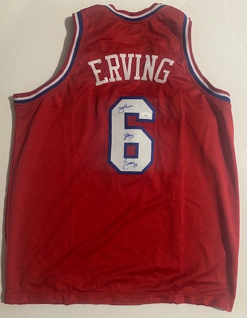 Julius Erving hand signed this replica jersey. A JSA Certificate of Authenticity is included.