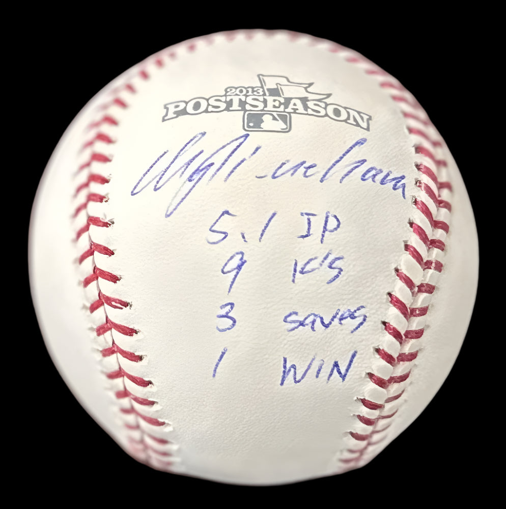 Koji Uehara hand signed this postseason baseball with “5.1 IP, 9Ks, 3 Saves, 1 Win” Inscription.