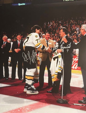 Ray Bourque and Phil Esposito hand signed this 16x20 photo. A Sure Shot Promotions Certificate of Authenticity is included.