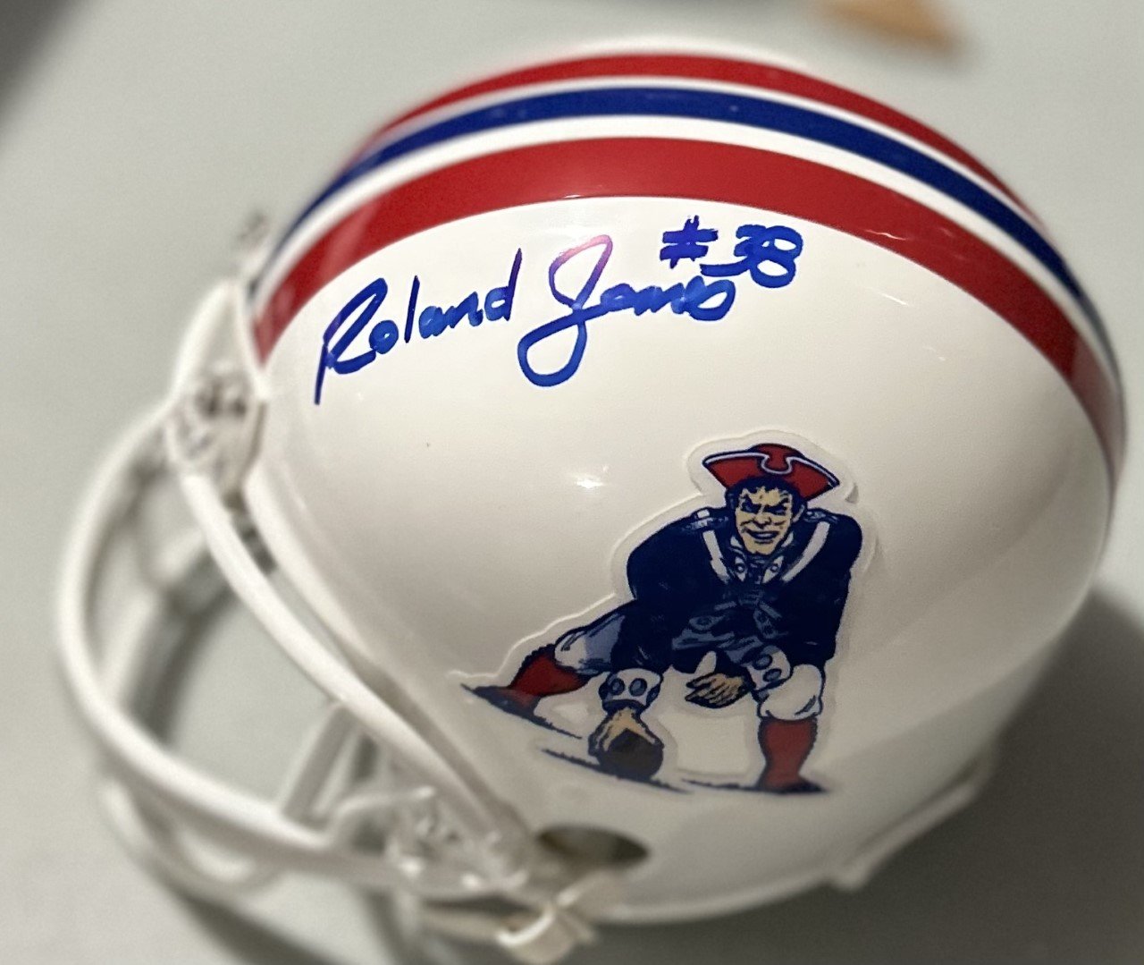 Roland James hand signed this throwback Patriots Mini Helmet. A Sure Shot Promotions Certificate of Authenticity is included.