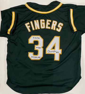 WS Champ Rollie Fingers hand signed this Oakland A’s jersey with a “HOF ‘92”, “7x ALL STAR”, “341 SAVES, and “81 CY YOUNG, MVP” inscriptions. A Sure Shot Promotions Certificate of Authenticity is included.