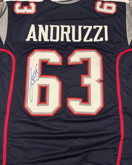 Joe Andruzzi hand signed this replica jersey with 3x SB Champ inscription.