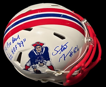 Patriots Legend Stanley Morgan hand signed this Patriots Throwback mini helmet with a Pats HOF and Pro Bowl inscription