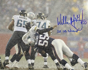 Willie McGinest hand signed this 8x10 glossy photo with a "3x SB Champs" inscription. A Sure Shot Promotions Certificate of Authenticity is included.